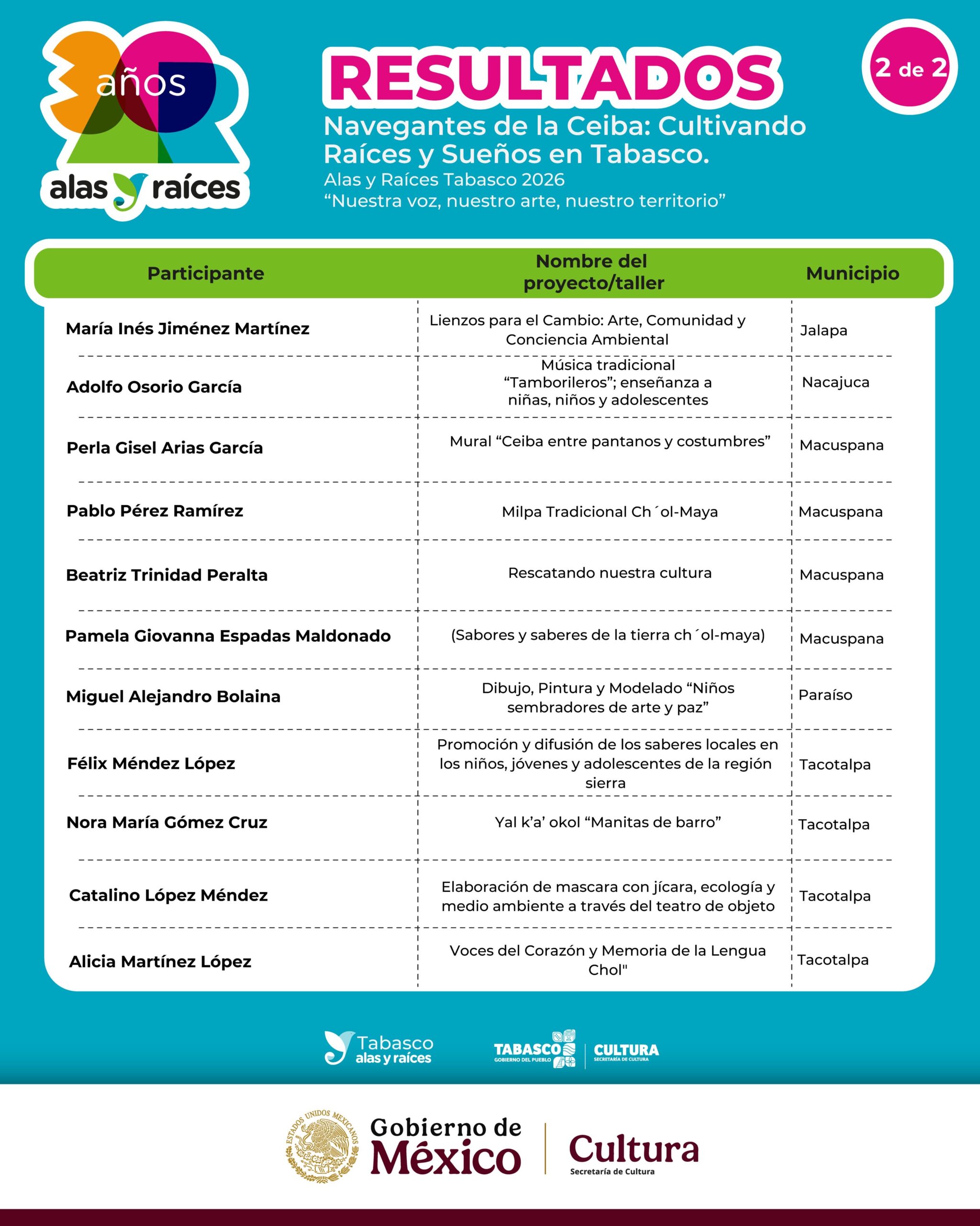 Villahermosa, Tabasco.– Como parte de las acciones para fomentar el desarrollo cultural desde las infancias y juventudes, el Gobierno del Estado, a través de la Secretaría de Cultura, dio a conocer los resultados de la convocatoria “Navegantes de la Ceiba: Cultivando Raíces y Sueños en Tabasco”, Alas y Raíces Tabasco 2026.