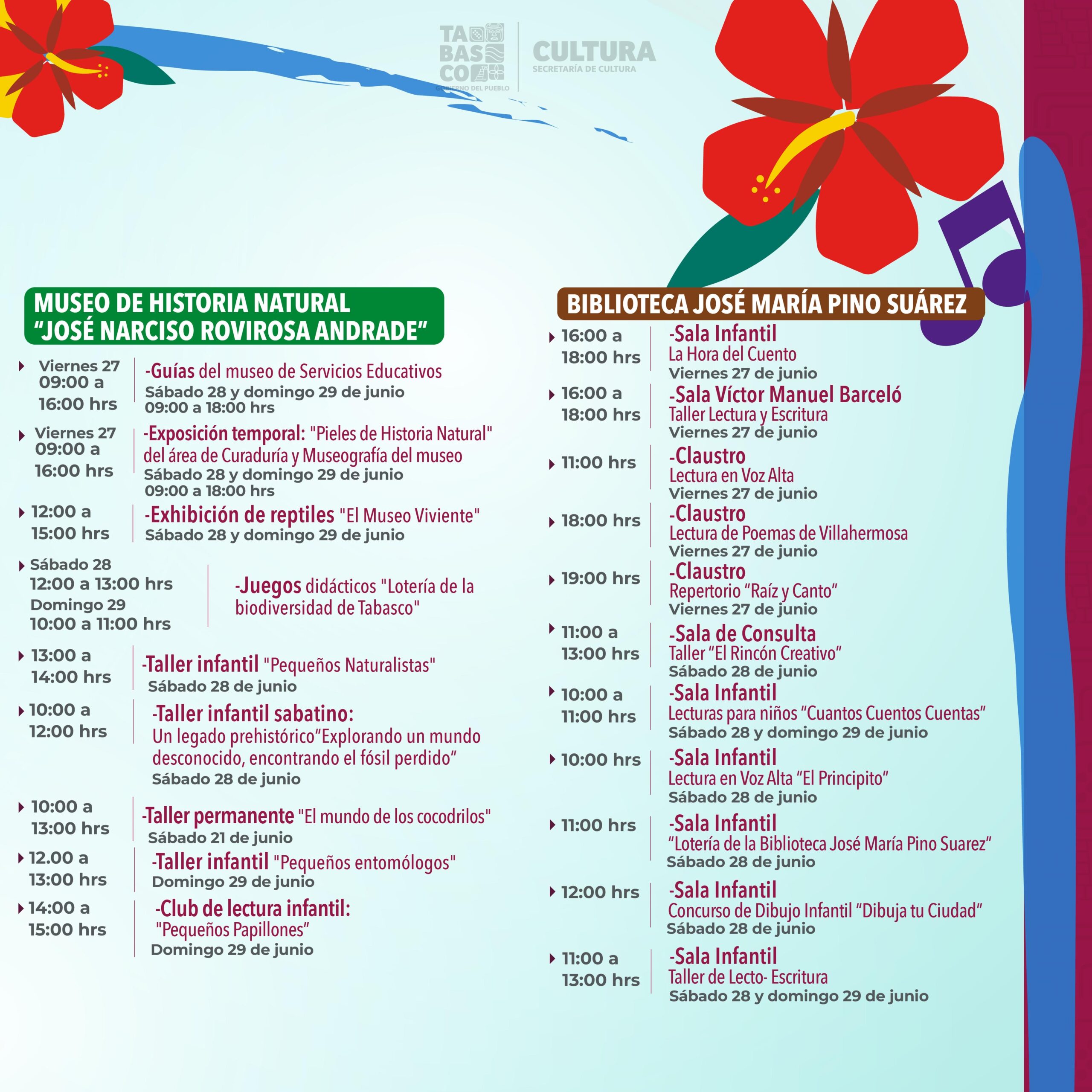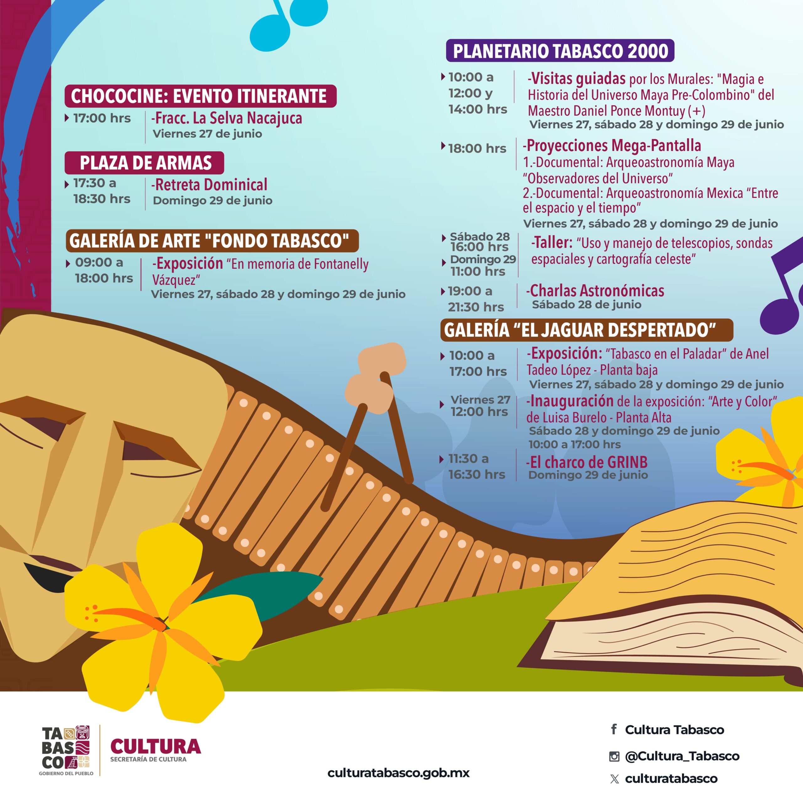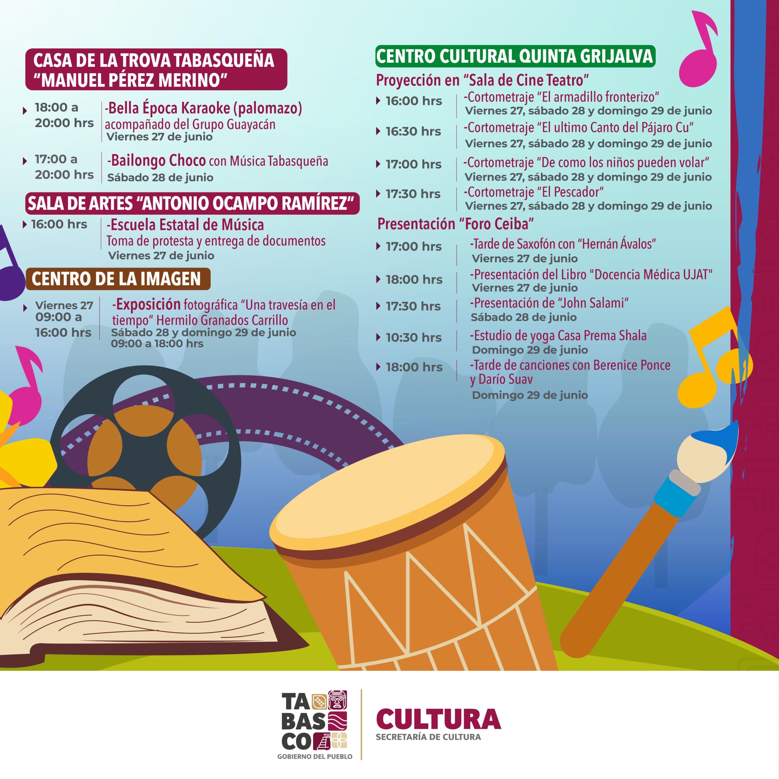 La Secretaría de Cultura del Estado de Tabasco ha preparado una amplia y diversa cartelera de actividades para este fin de semana, del 27 al 29 de junio, con propuestas dirigidas a todos los públicos y repartidas en museos, bibliotecas, galerías y espacios culturales de Villahermosa y otros municipios.