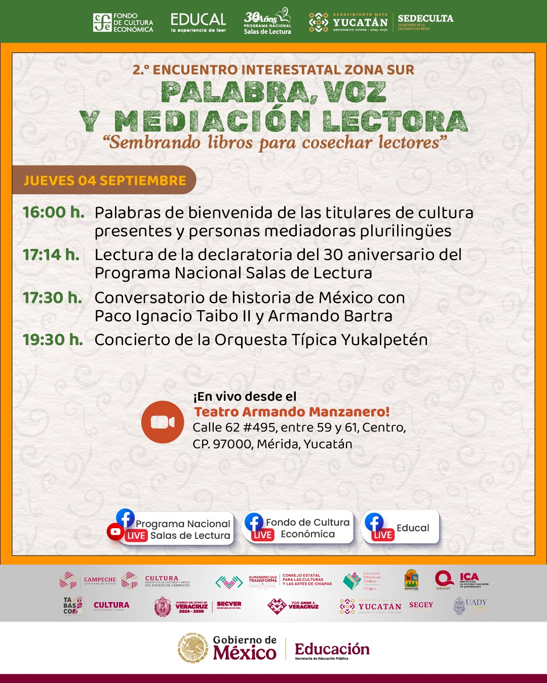 Del 04 al 07 de septiembre se llevará a cabo el Segundo Encuentro Interestatal Zona Sur. Palabra, voz y mediación lectora, organizado por el Fondo de Cultura Económica (FCE), mediante el Programa Nacional Salas de Lectura (PNSL), en coordinación con el Gobierno del Estado de Yucatán, a través de la Secretaría de la Cultura y las Artes.
