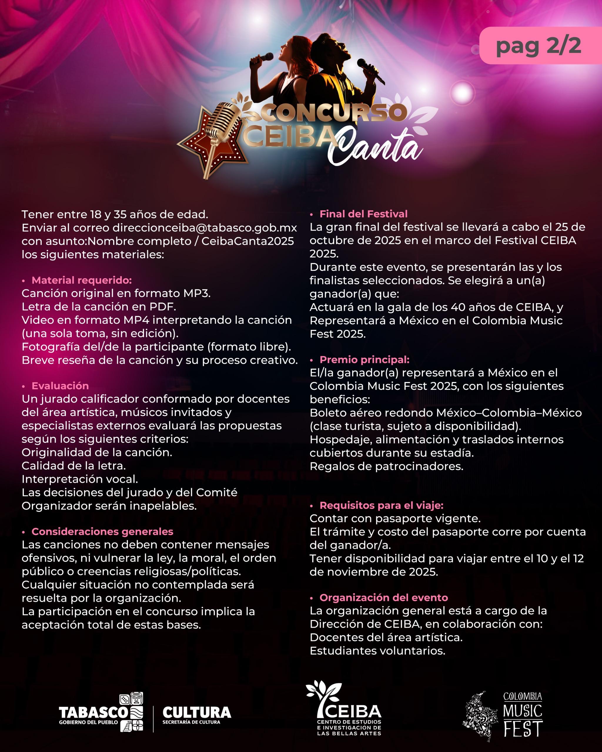 El concurso está dirigido a estudiantes vigentes y egresados de CEIBA con edades entre 18 y 35 años, quienes podrán participar con canciones originales de su autoría. Los aspirantes deberán enviar letra, audio y video de interpretación, además de una reseña sobre el proceso creativo de su obra.