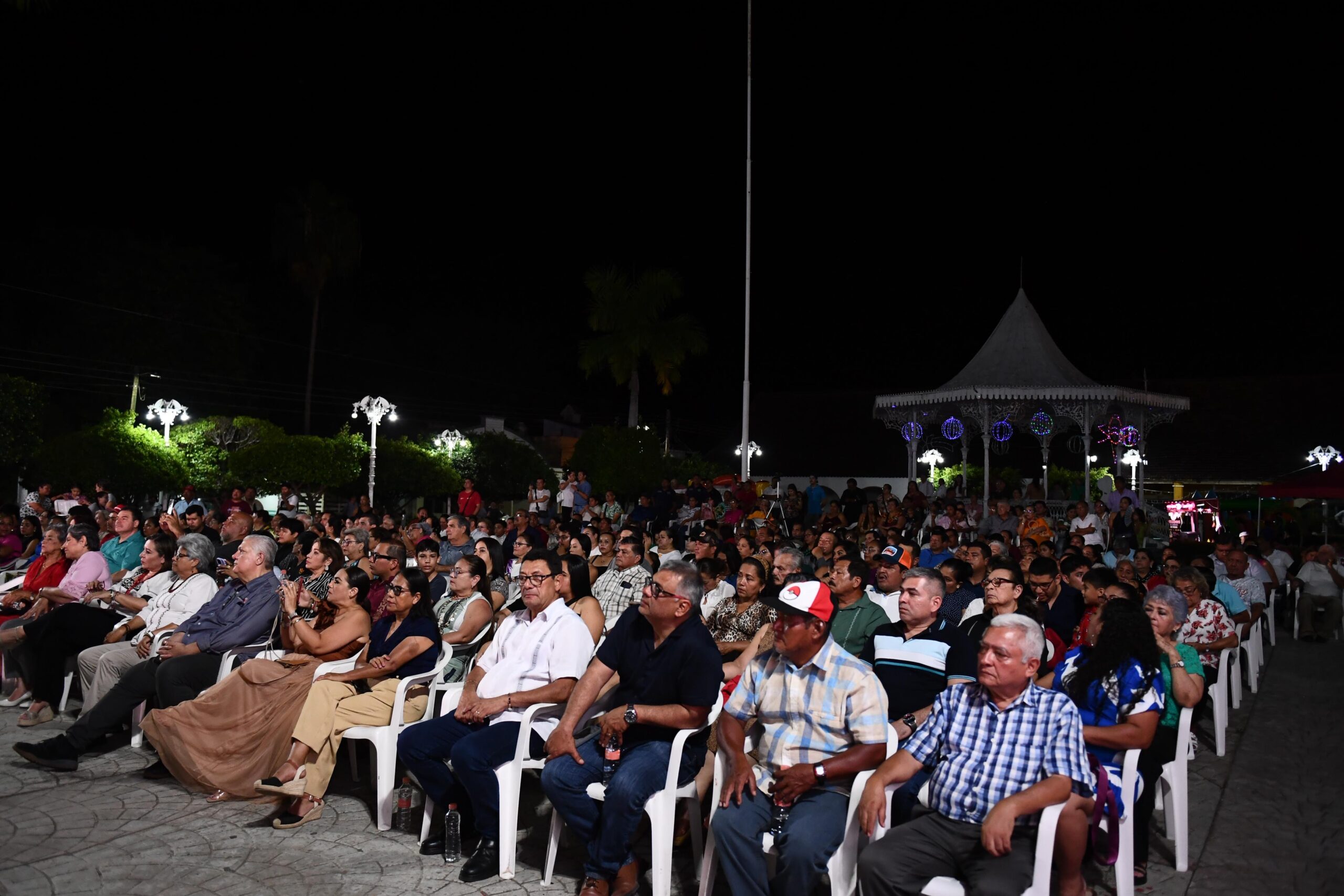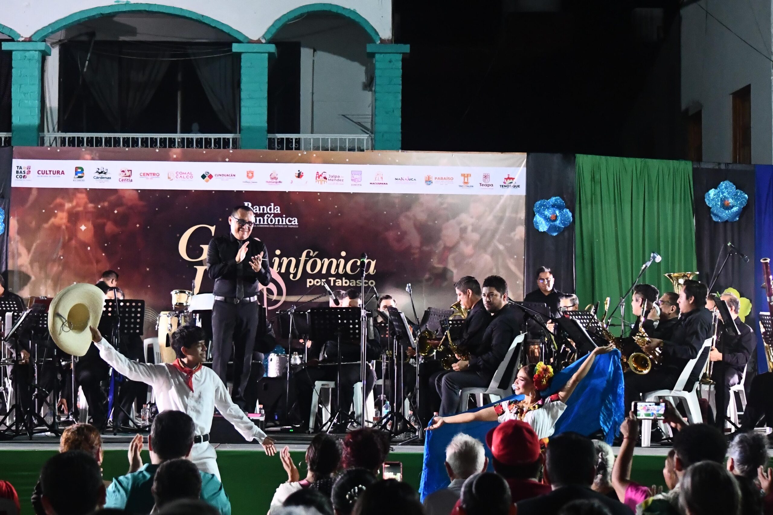 Uno de los momentos más destacados de la noche fue la interpretación del “Danzón No. 2”, que contó con la participación especial del pianista balancanense Ventura Marín Pozo, mientras que la pieza “Campeona Rosita” fue acompañada por una pareja de bailarines tabasqueños originarios de este mismo municipio, quienes aportaron color y tradición a la presentación.