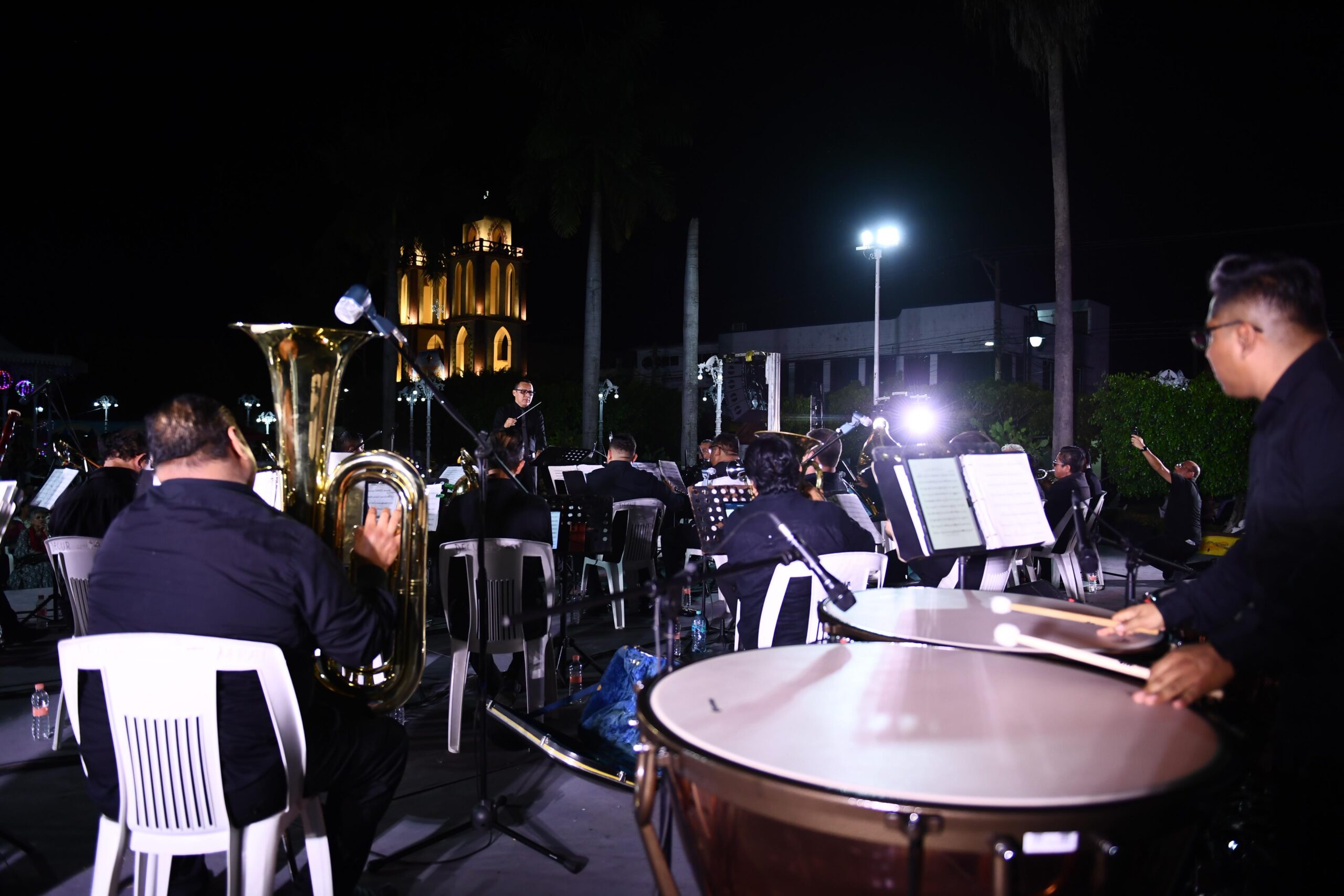 La Banda Sinfónica ofreció un variado repertorio que incluyó piezas de gran fuerza musical como “Centuria”, “Capitán América”, el clásico “Bolero de Ravel”, “Love Story”, “Lassus Trombon”, “Danzón No. 2”, “La Máquina de Escribir”, así como obras populares como “El Cumbanchero”, “Campeona Rosita” y el tema “A Tabasco–Balancán”, que despertó el entusiasmo del público presente.