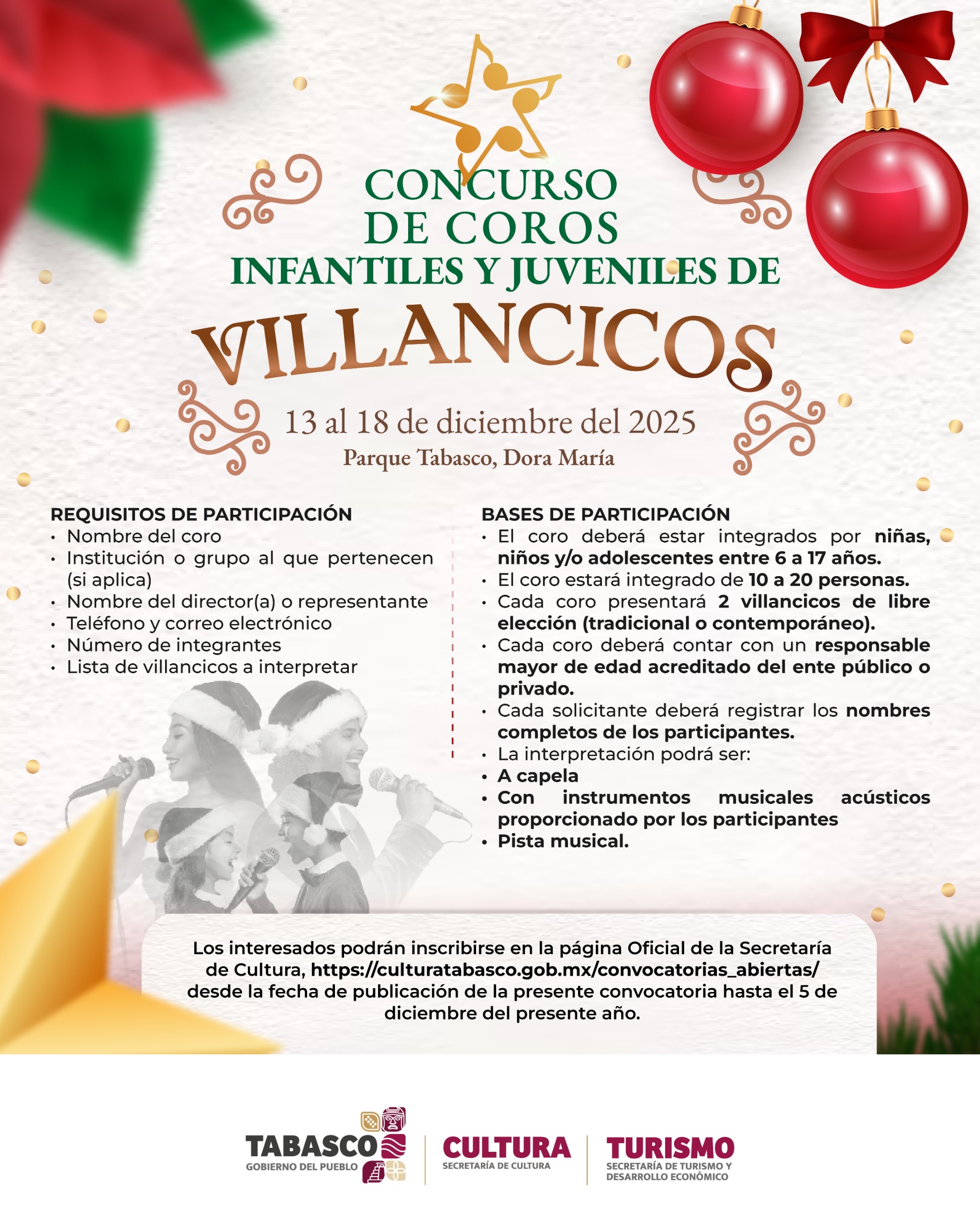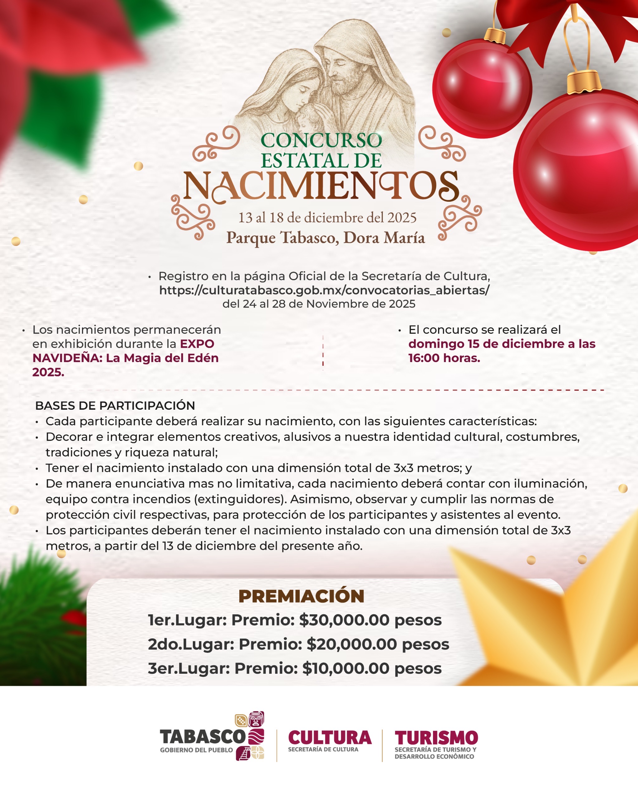 Las bases completas pueden consultarse en https://cultura.tabasco.gob.mx/convocatorias_abiertas/ y en las redes sociales de la Secretaría. Ambas convocatorias representan una oportunidad para que la comunidad participe de manera creativa en una de las celebraciones más significativas del año, contribuyendo a que la Navidad en Tabasco se viva con identidad, unión y espíritu comunitario