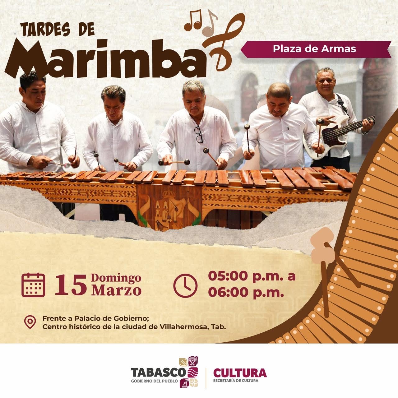 • 17:00 a 18:00 hrs — Tardes de Marimba en Plaza de Armas, con la Marimba del Gobierno del Estado de Tabasco.