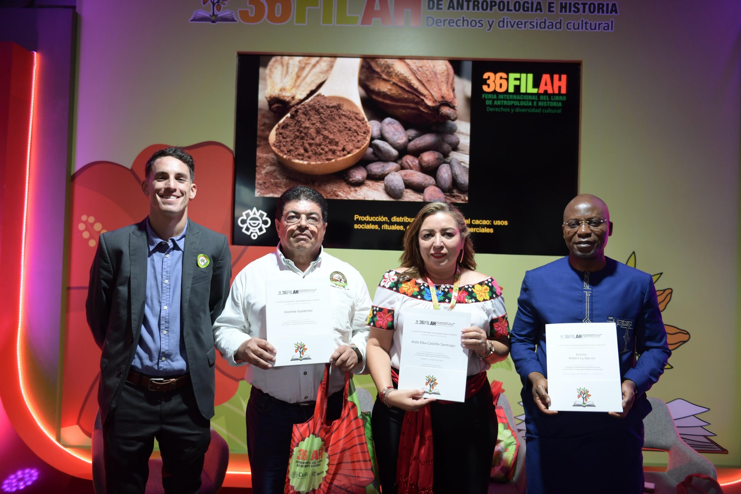 También en la Carpa 3 se llevó a cabo el conversatorio “Producción, distribución y consumo del cacao: usos sociales, rituales, gastronómicos y comerciales”, con la participación del Excmo. Sr. Ly Djerou Robert, embajador de Costa de Marfil en México; la Secretaria de Cultura de Tabasco, Aída Elba Castillo Santiago; y el empresario cacaotero Vicente Gutiérrez Cacep, quienes resaltaron la relevancia histórica y económica de este fruto que ha hermanado a Tabasco con el mundo.