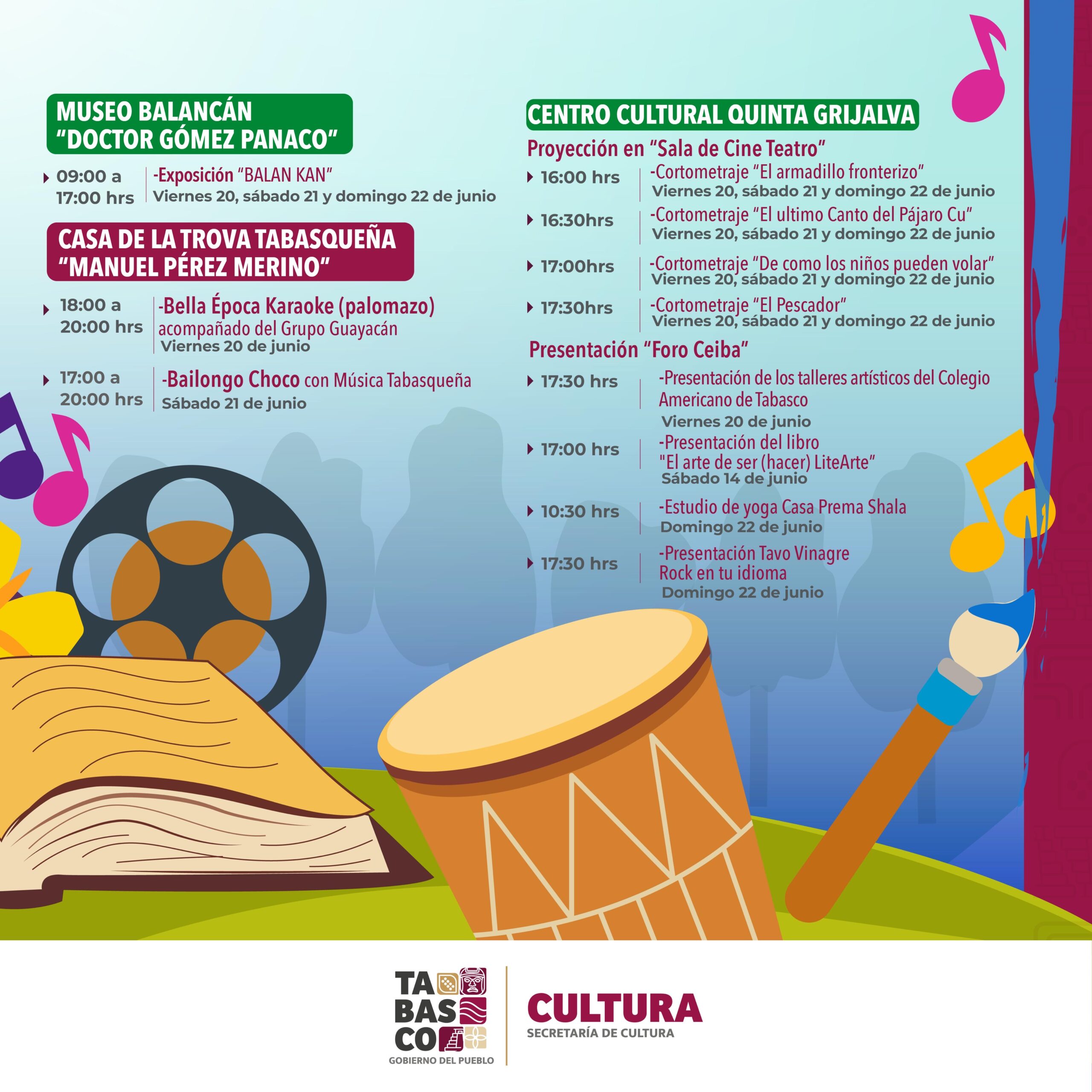 Así, la Secretaría de Cultura de Tabasco reitera su compromiso con una cultura incluyente, diversa y viva, convocando a las familias tabasqueñas a apropiarse de los espacios públicos y disfrutar de un fin de semana lleno de identidad, arte y descubrimiento.