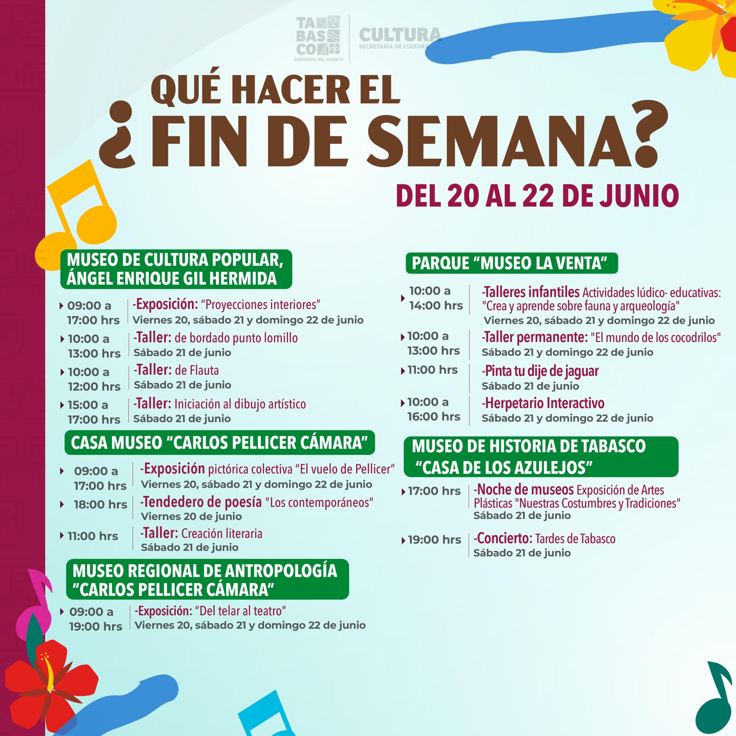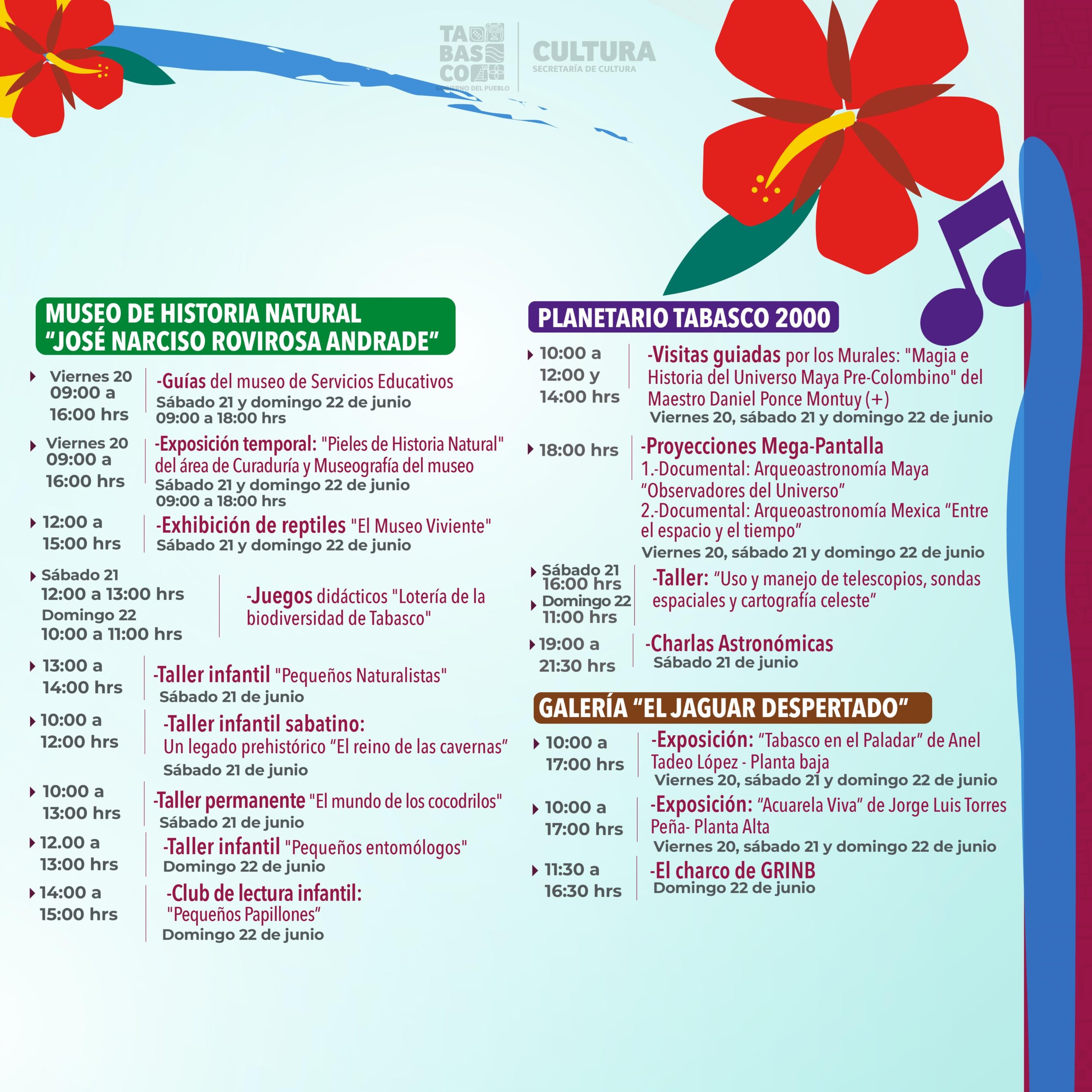 Museos abiertos, talleres para niñas y niños, conciertos, charlas astronómicas, juegos, poesía y cine: este fin de semana Tabasco se convertirá en un verdadero epicentro cultural, gracias a la nutrida agenda que la Secretaría de Cultura ha dispuesto para el disfrute del pueblo.